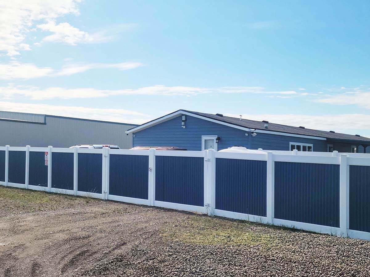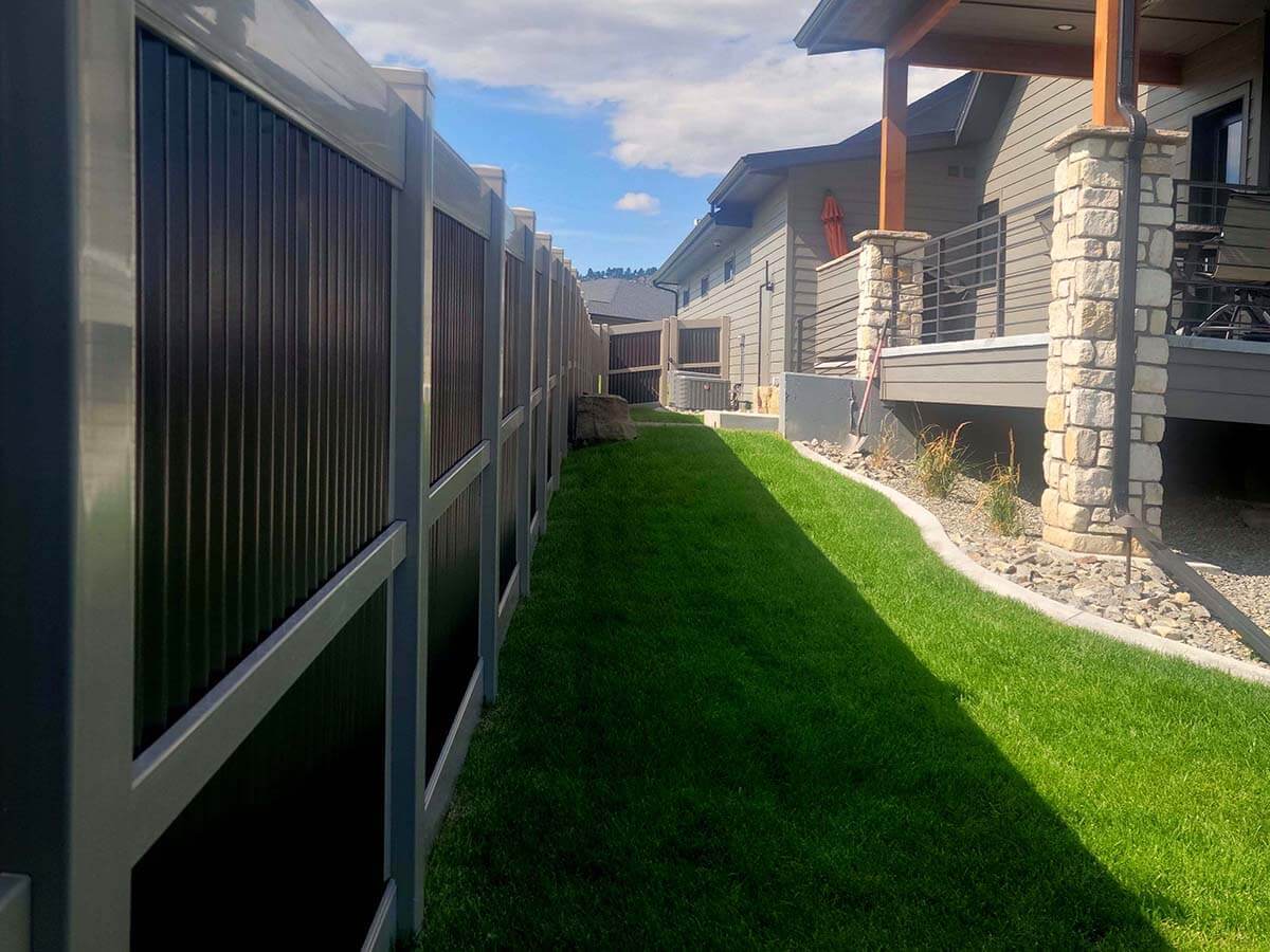Corrugated Steel fence with vinyl rails and posts installed for a residential home